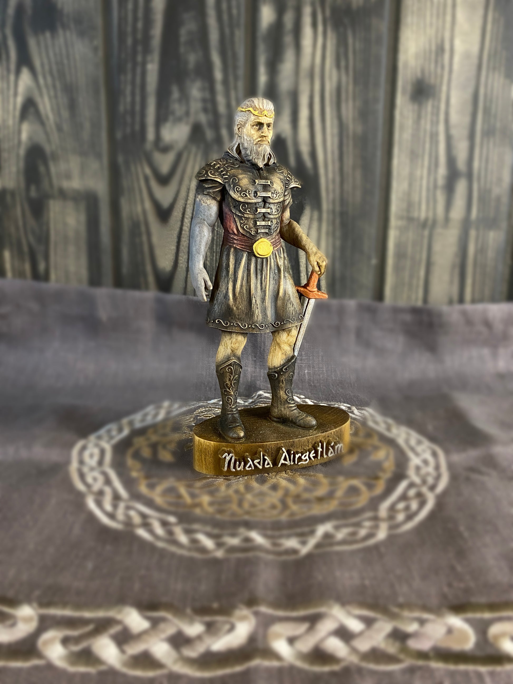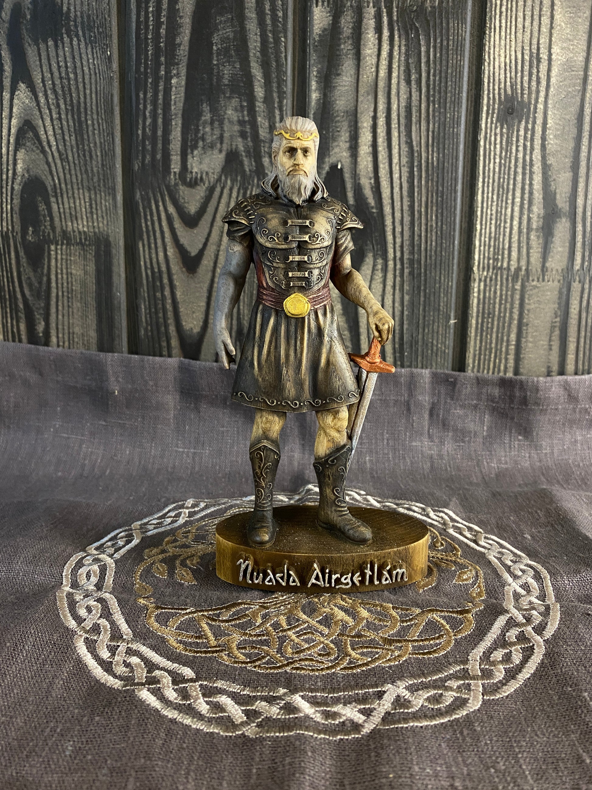 Nuada is depicted as a majestic and strong god with a silver arm that he lost in battle. He wears a golden crown and dresses elegantly. His silver hand symbolizes his wisdom, power and is endowed with special magical powers.