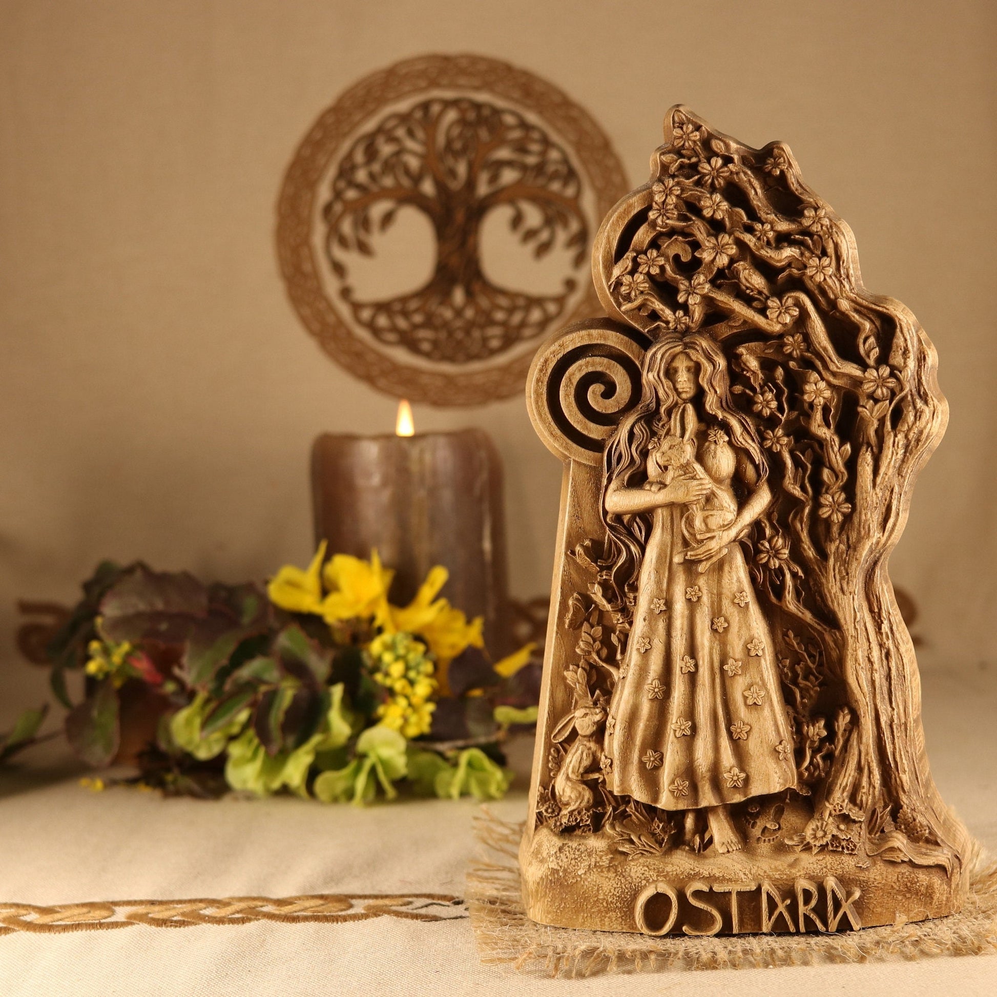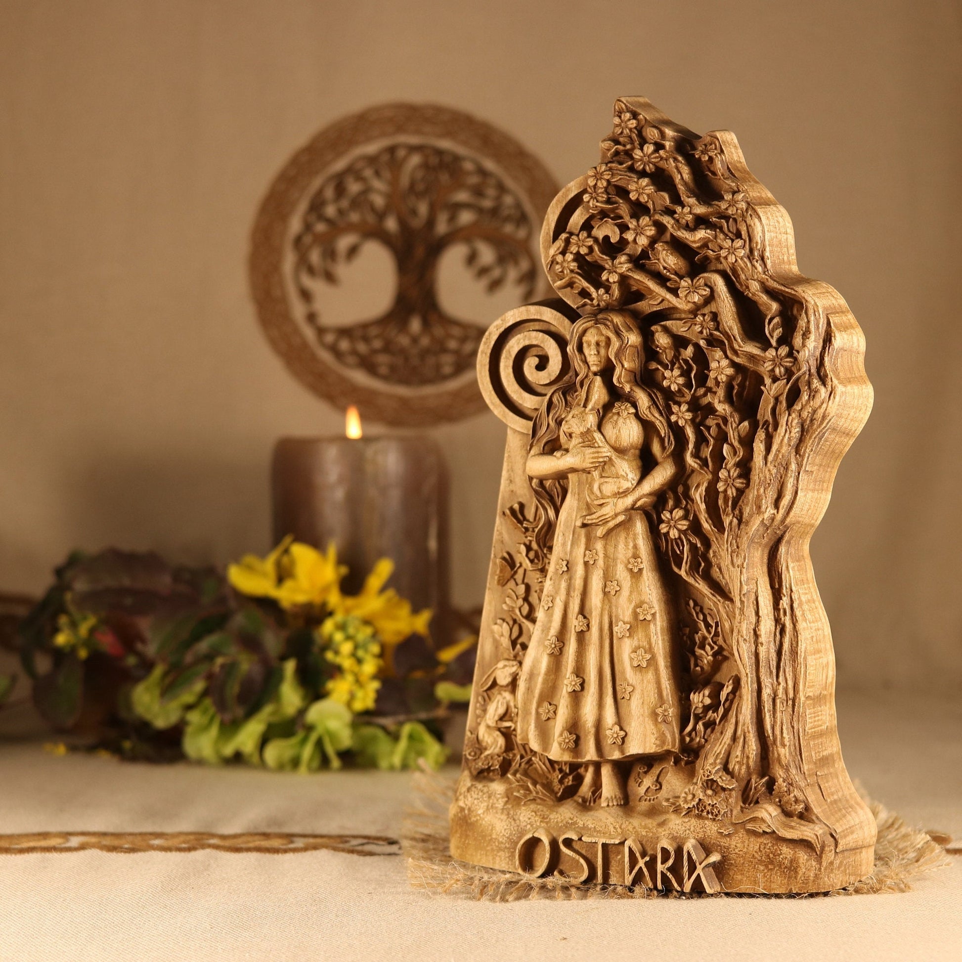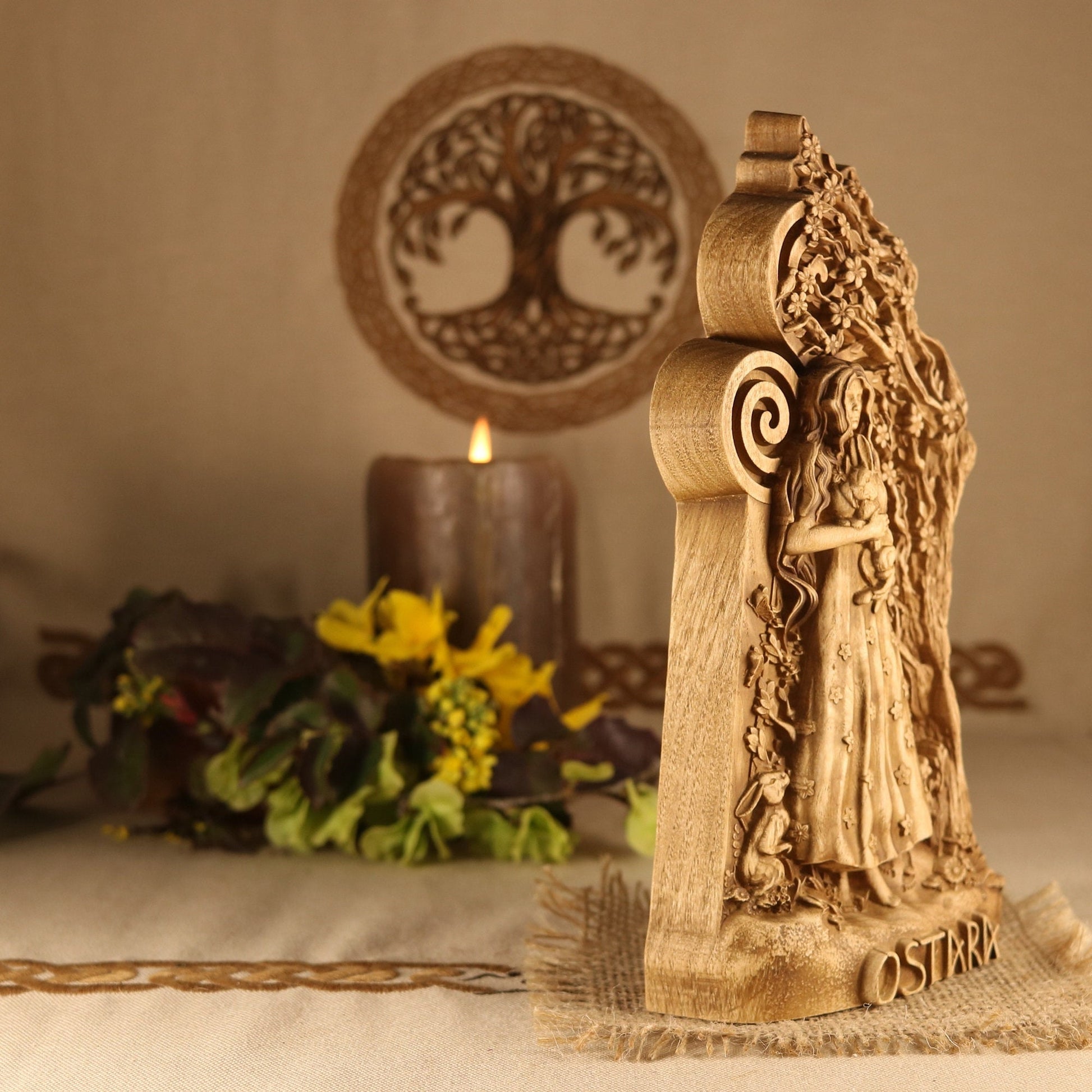 Introducing Ostara, the goddess of dawn, joy, fertility, and vitality! This beautiful wood carving is handmade from ecological materials, making it the perfect addition to your Easter decor. The Norse pagan design is perfect for those who want to add a touch of nature to their home. The varnish coating protects the sculpture from the elements and ensures that it will last for years. Give your home a little bit of magic with Ostara!