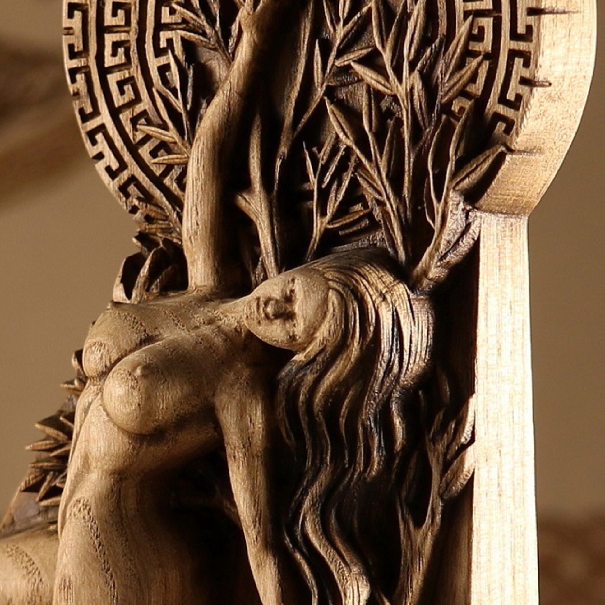 Persephone, the Greek goddess of the underworld, is also the goddess of spring growth. This beautiful wooden statue is made of an ecological ash tree and coated with varnish to protect it from the elements. Standing nearly two feet tall, this regal statue is sure to make a statement in any home or garden.