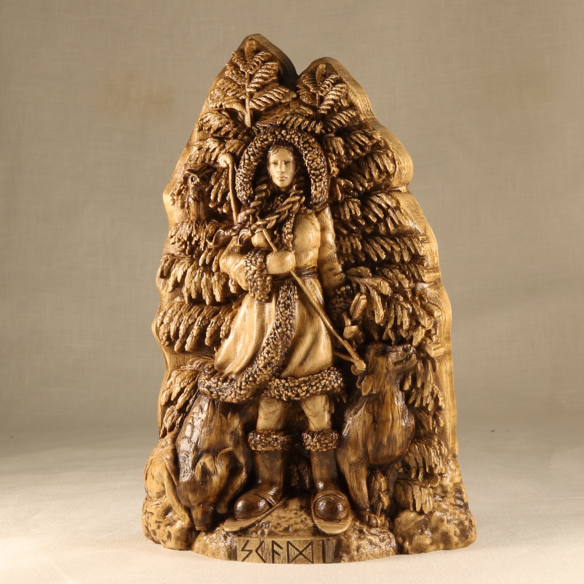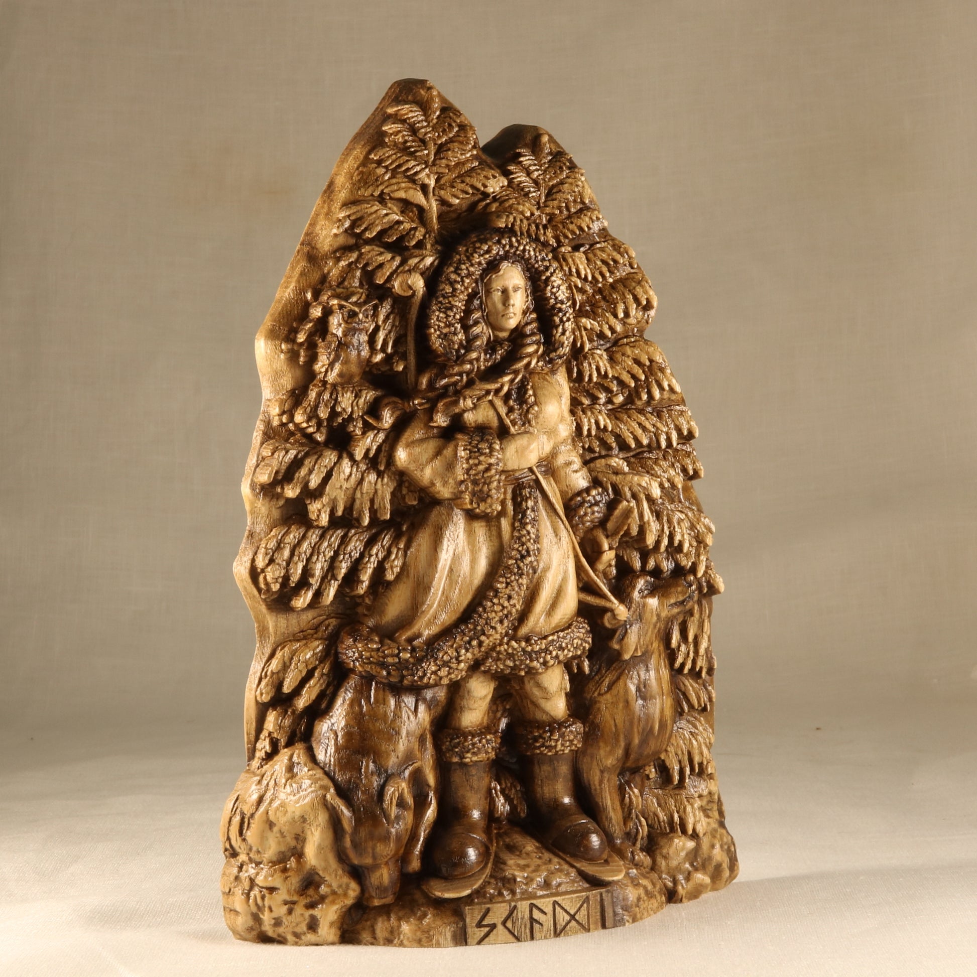 Introducing Skadi, the Scandinavian pagan goddess of the hunt! This beautiful statue is handmade from ecological ash wood and features intricate carving and a varnish finish. Skadi is the wife of the god Njord and is a skilled skier and hunter. This unique statue makes a great addition to any home or office and is sure to be a conversation starter. Order your Skadi statue today!