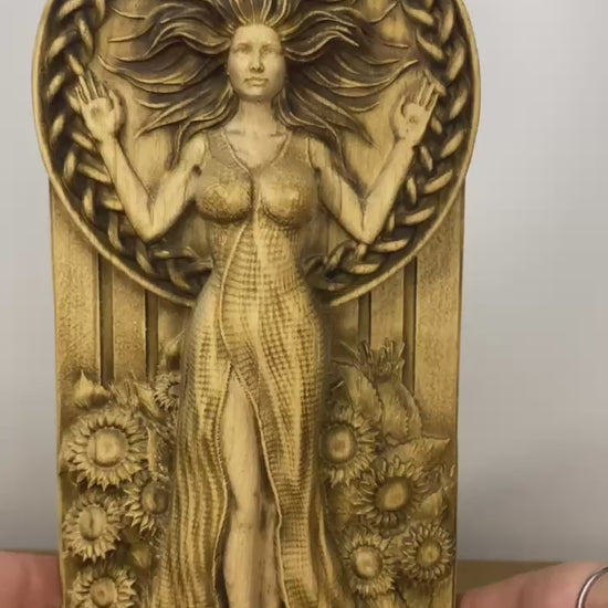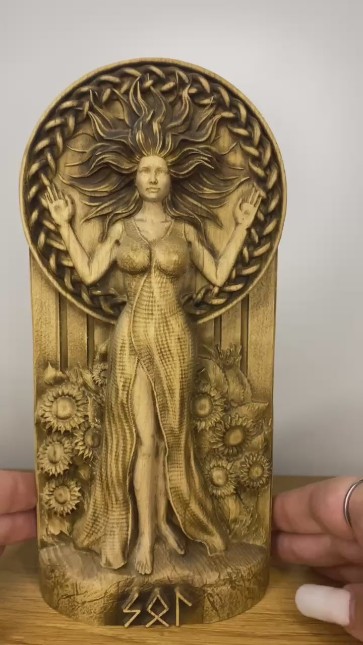 Introducing Sol, the goddess of the sun! This handmade wooden statue is carved from ecological material and makes a beautiful addition to any home. Perfect for use as a mini altar or decor, this Norse pagan-inspired piece is sure to add a touch of magic to your life. Sol is made from sustainable ash tree wood and is finished with varnish for protection. With her radiant presence, she is sure to bring light and joy into your space. Don't miss your chance to own a piece of history – order Sol today!
