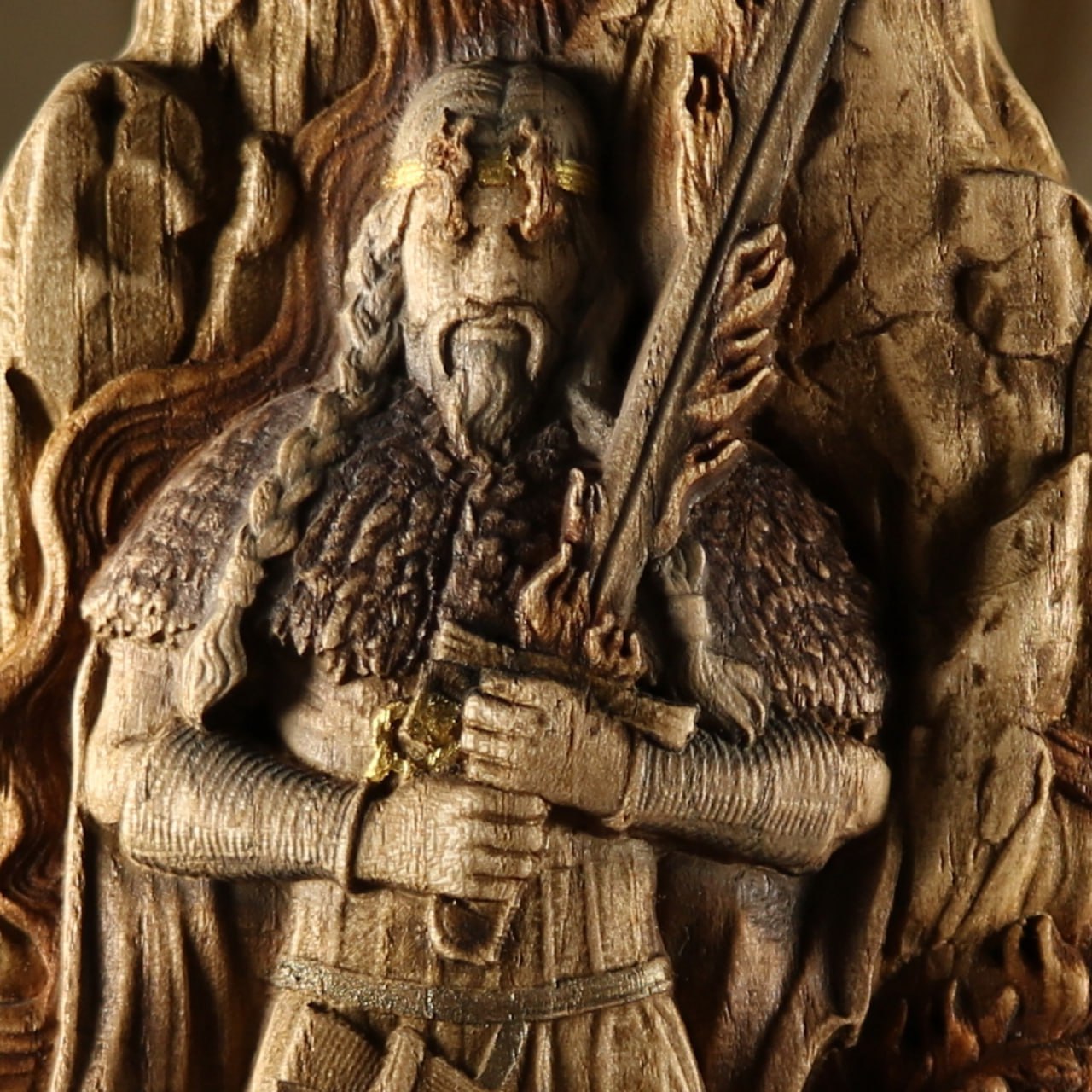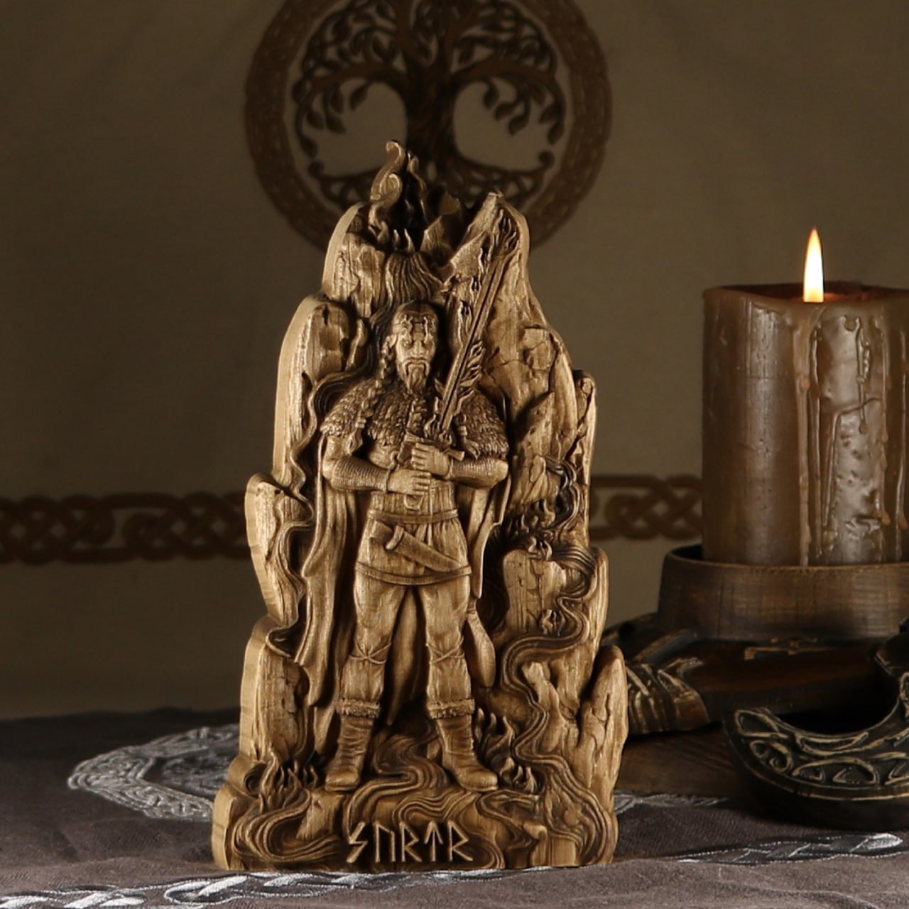 Surtr, the wood carved statue, is a captivating embodiment of the mighty fire giant from тorse mythology.