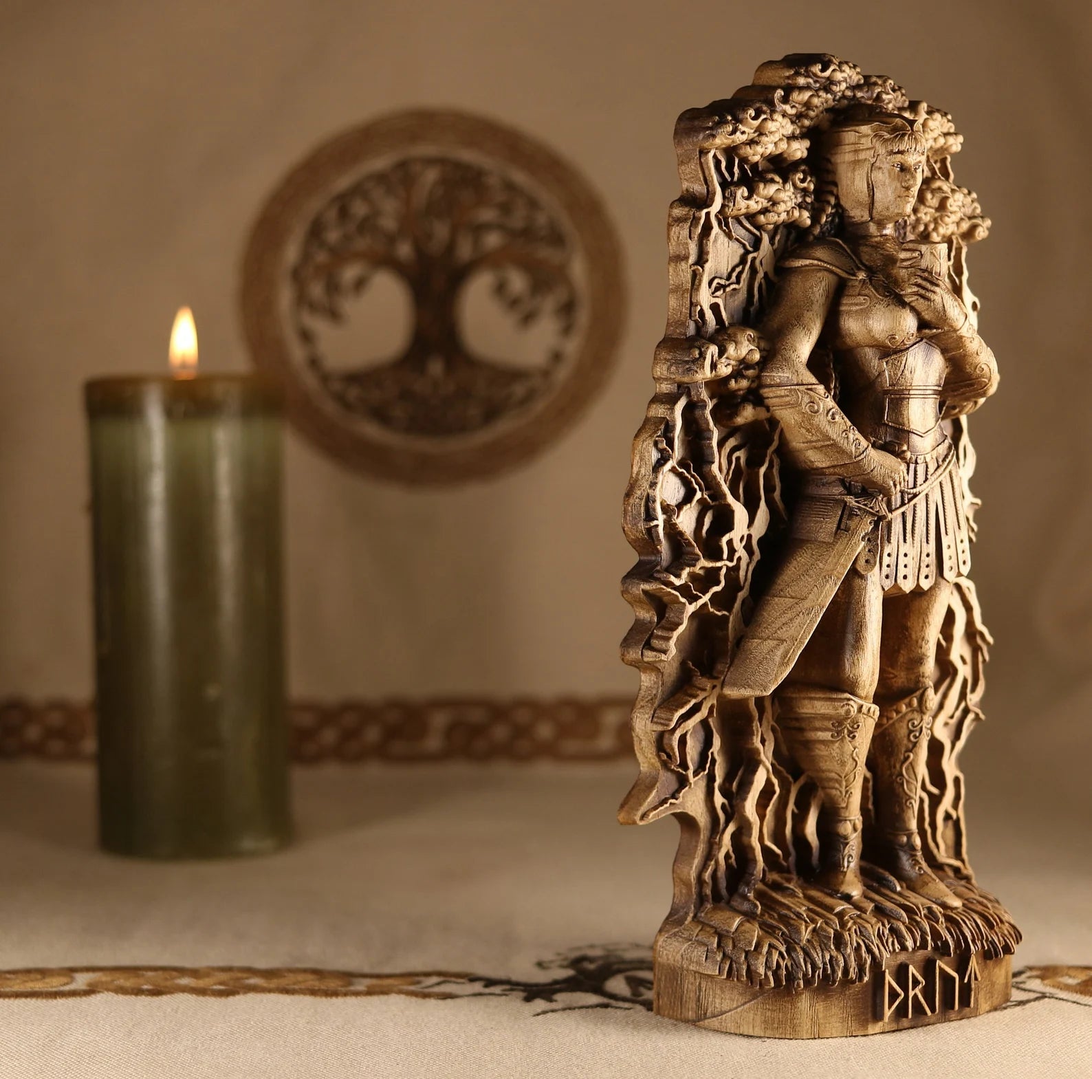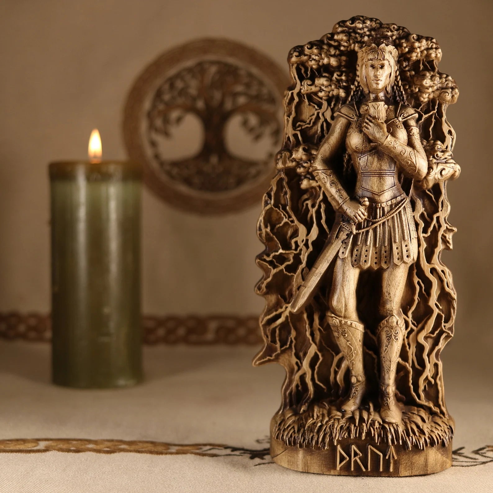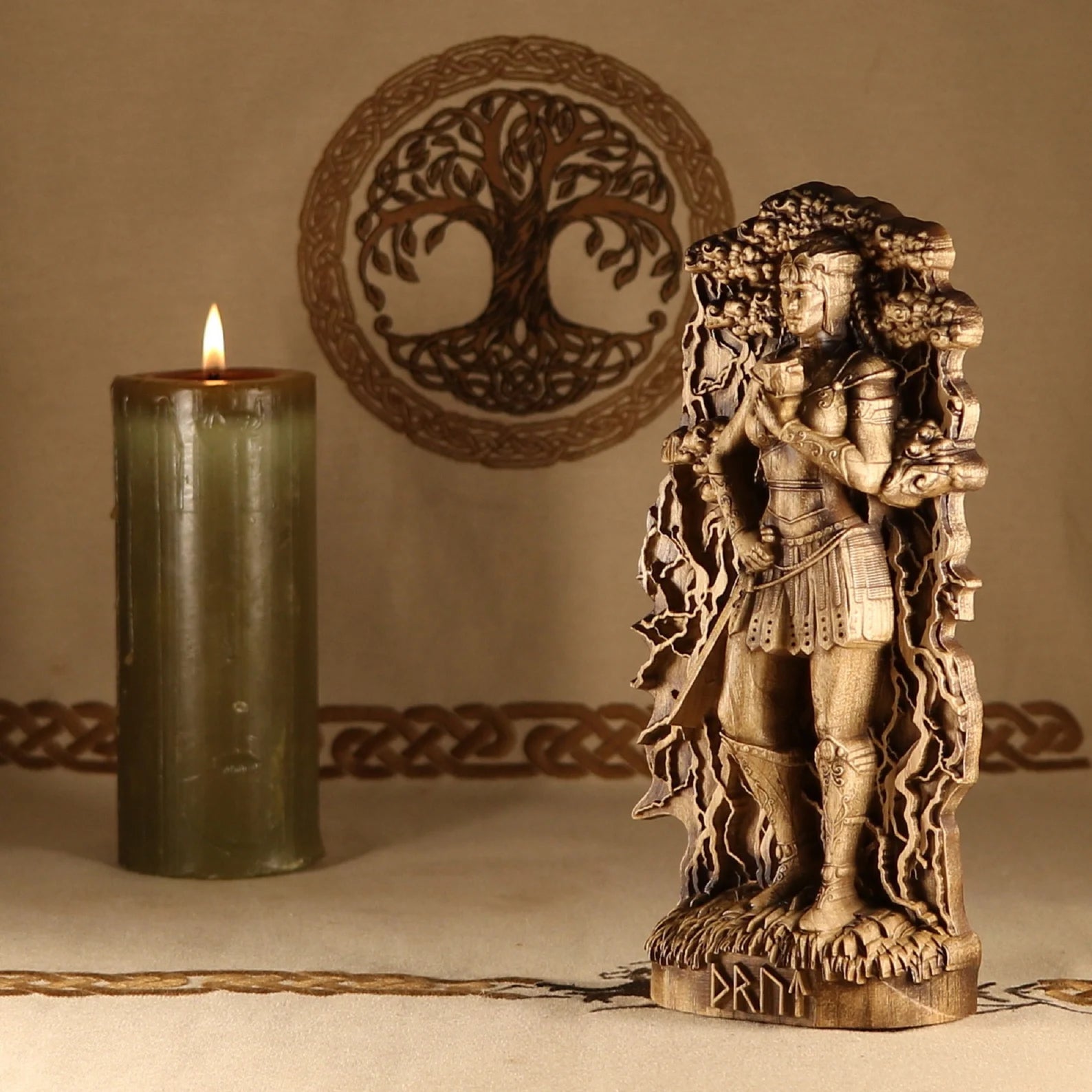 Looking for a goddess statue that is both eco-friendly and stylish? Look no further than Thrud, the Valkyrie! This beautiful wood carving is made from an ash tree and is perfect for any Norse pagan decor. The varnish coating protects the wood and gives it a beautiful shine.