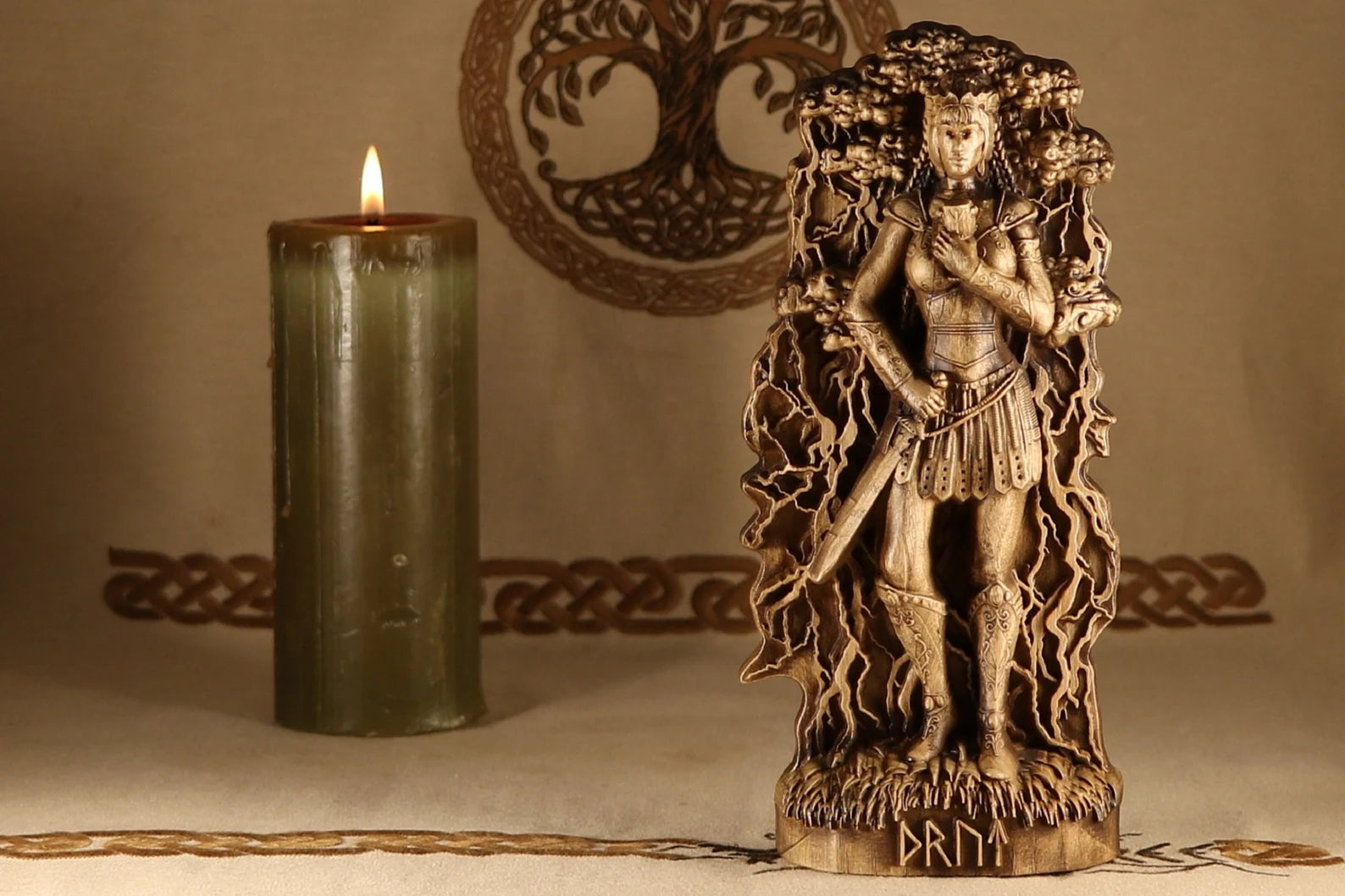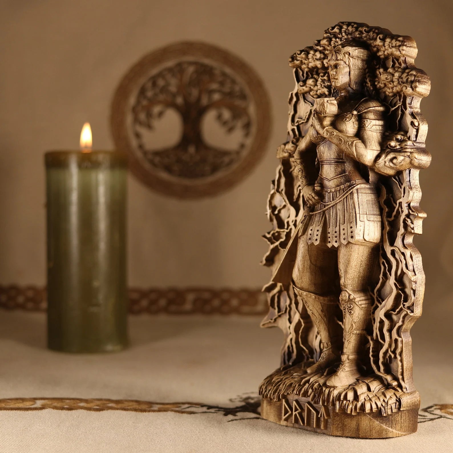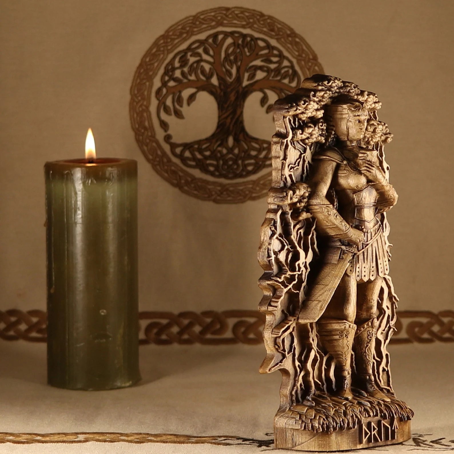 Looking for a goddess statue that is both eco-friendly and stylish? Look no further than Thrud, the Valkyrie! This beautiful wood carving is made from an ash tree and is perfect for any Norse pagan decor. The varnish coating protects the wood and gives it a beautiful shine.