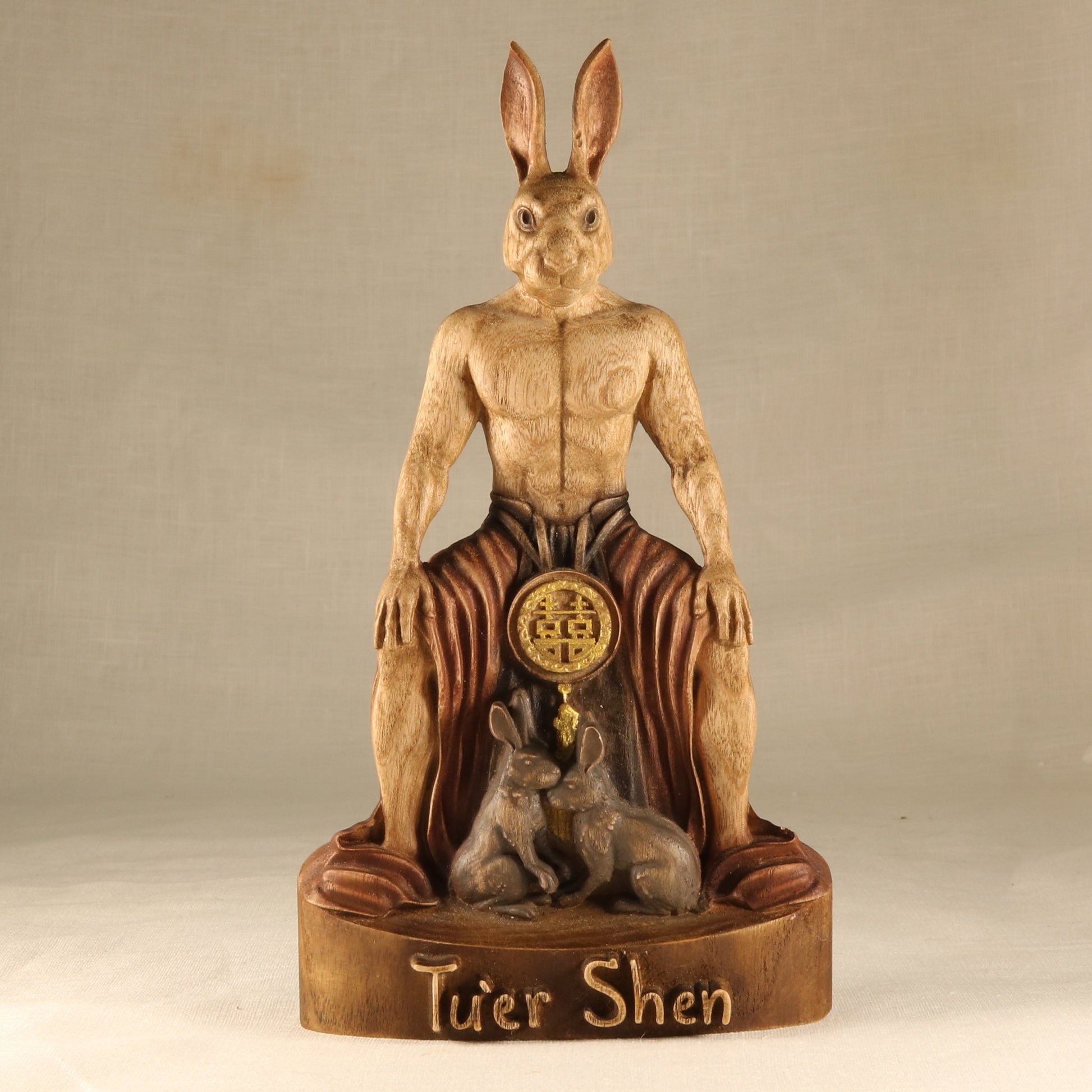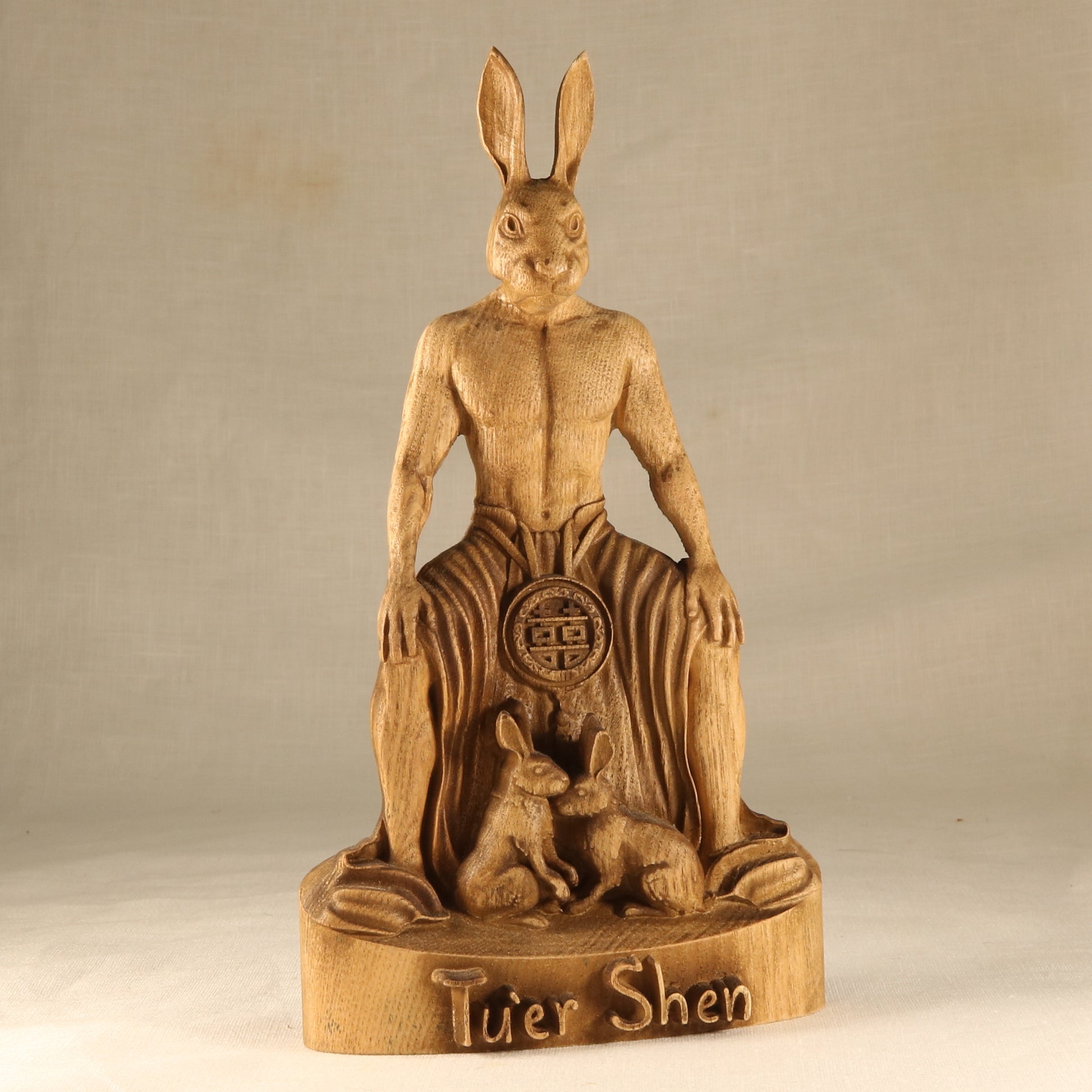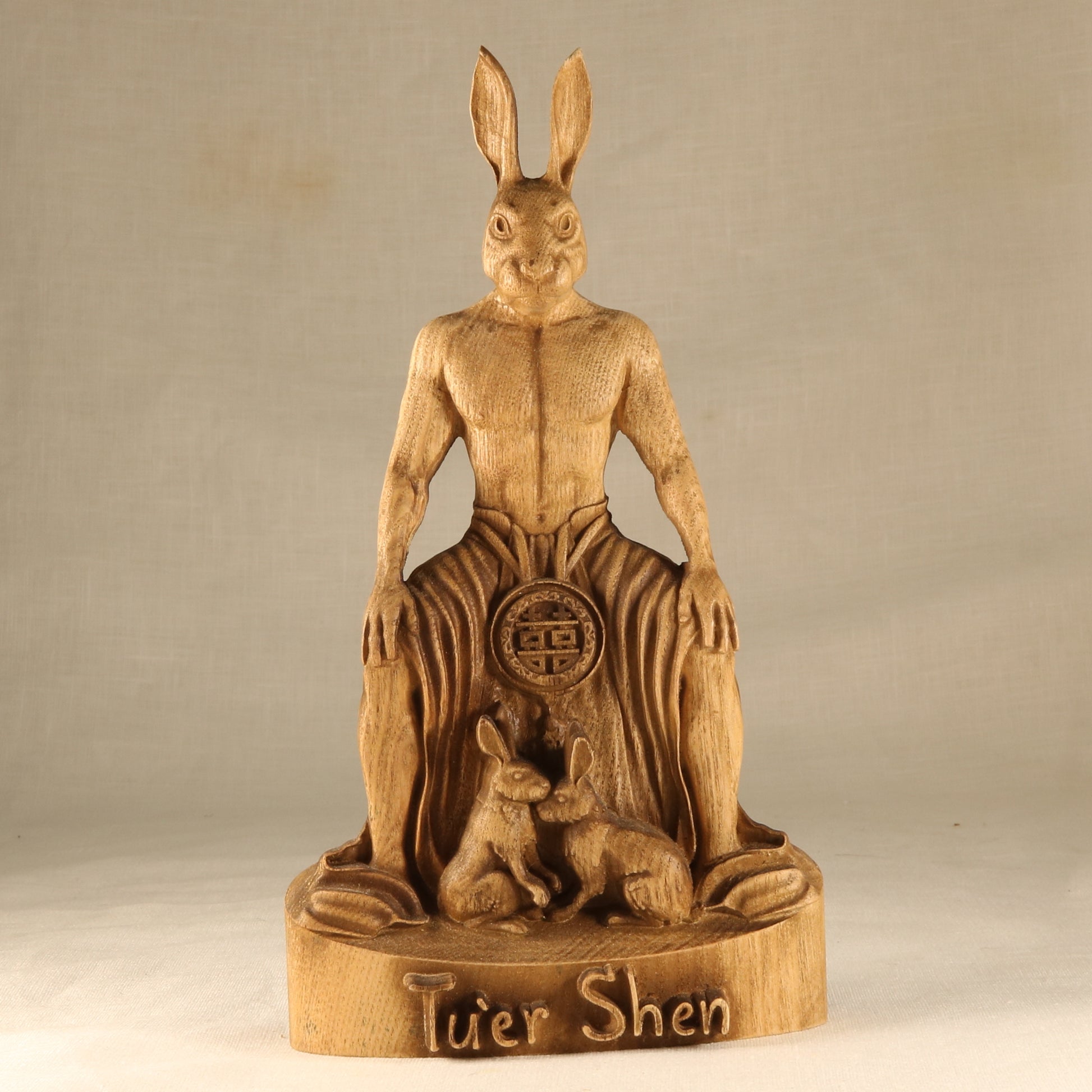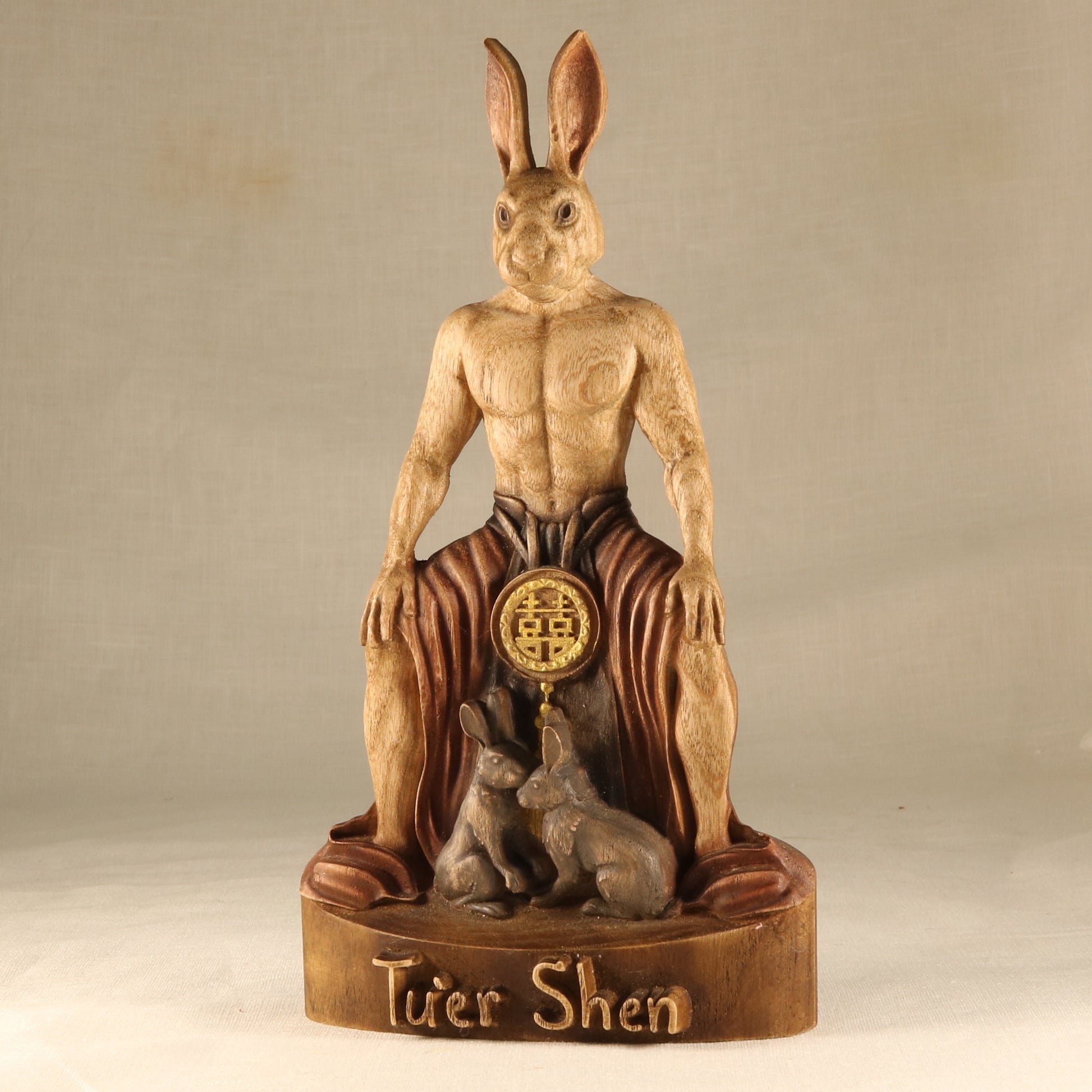 Tu'er Shen statue, Rabbit God, Chinese mythology, queer art, LGBT+ protector, carved wooden statue