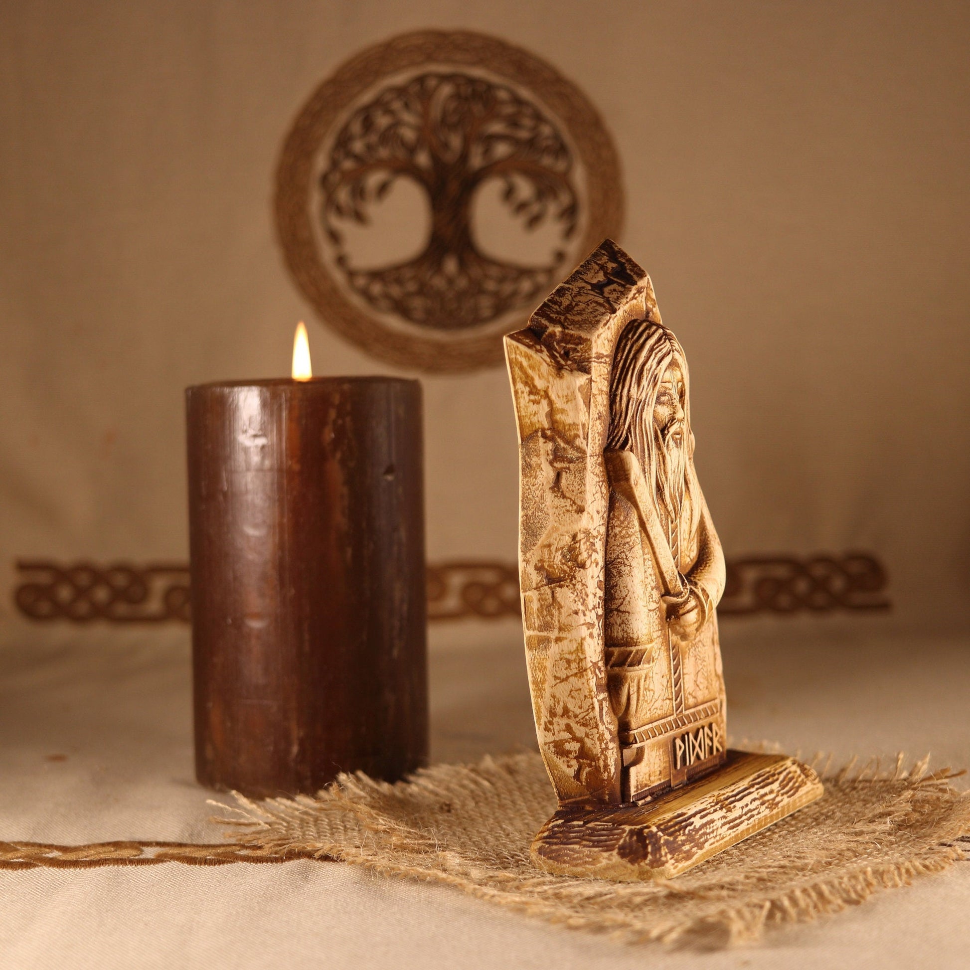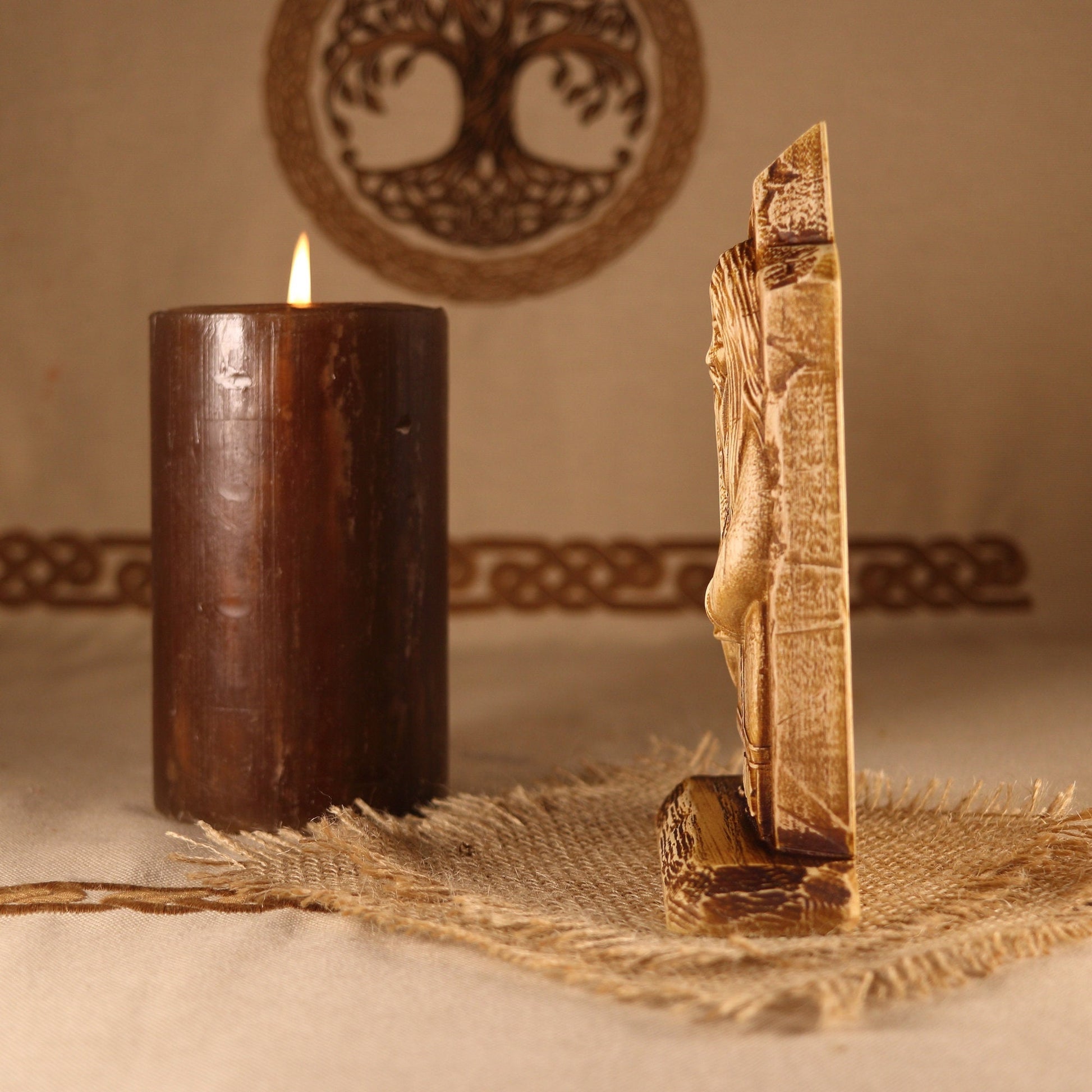 This magnificent Vidar statue is perfect for any Norse or pagan altar! Handcrafted from eco-friendly materials, this detailed carving is sure to please. The dark varnish finish gives it a regal look, while the intricate design is simply stunning. Whether you're looking to add to your collection or give a unique gift, this Vidar statue is sure to impress.