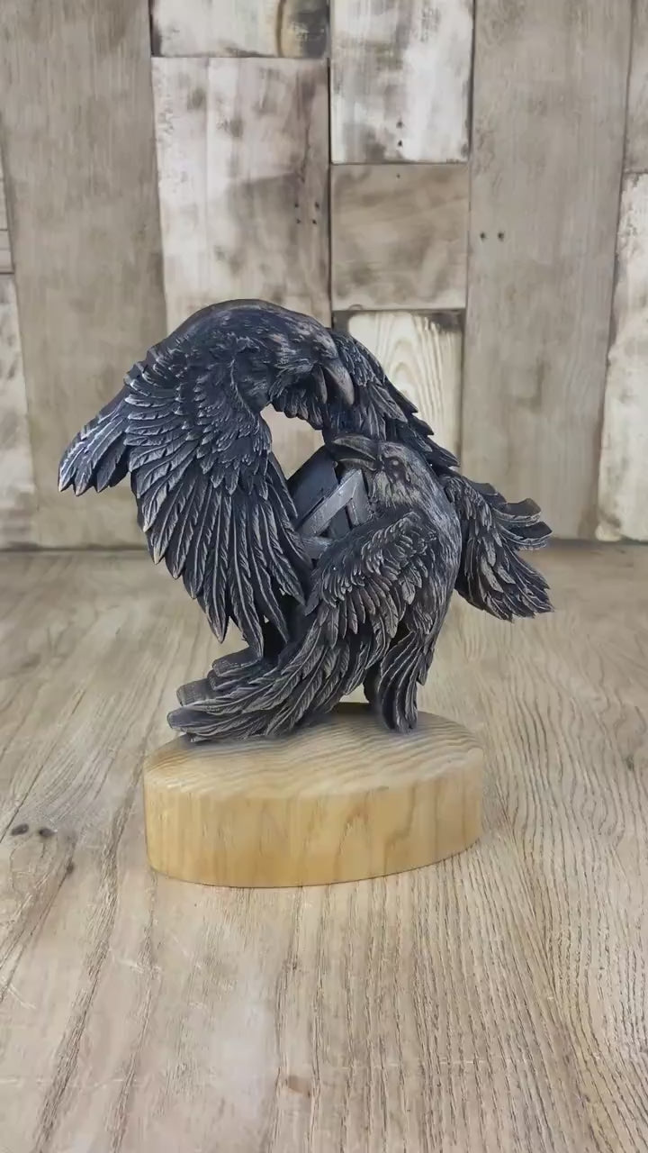Huginn and Muninn Wooden Statue Raven Art Viking-Inspired