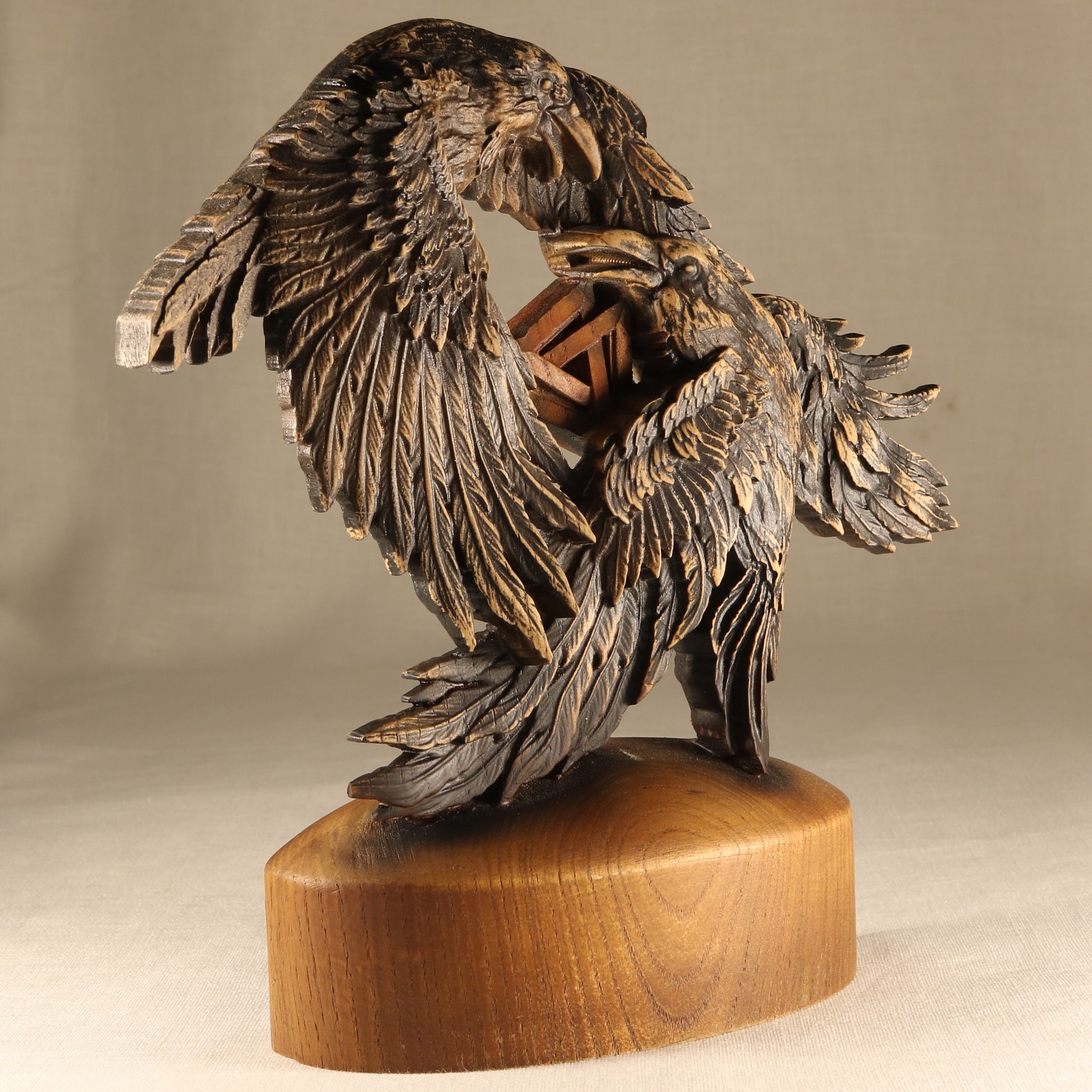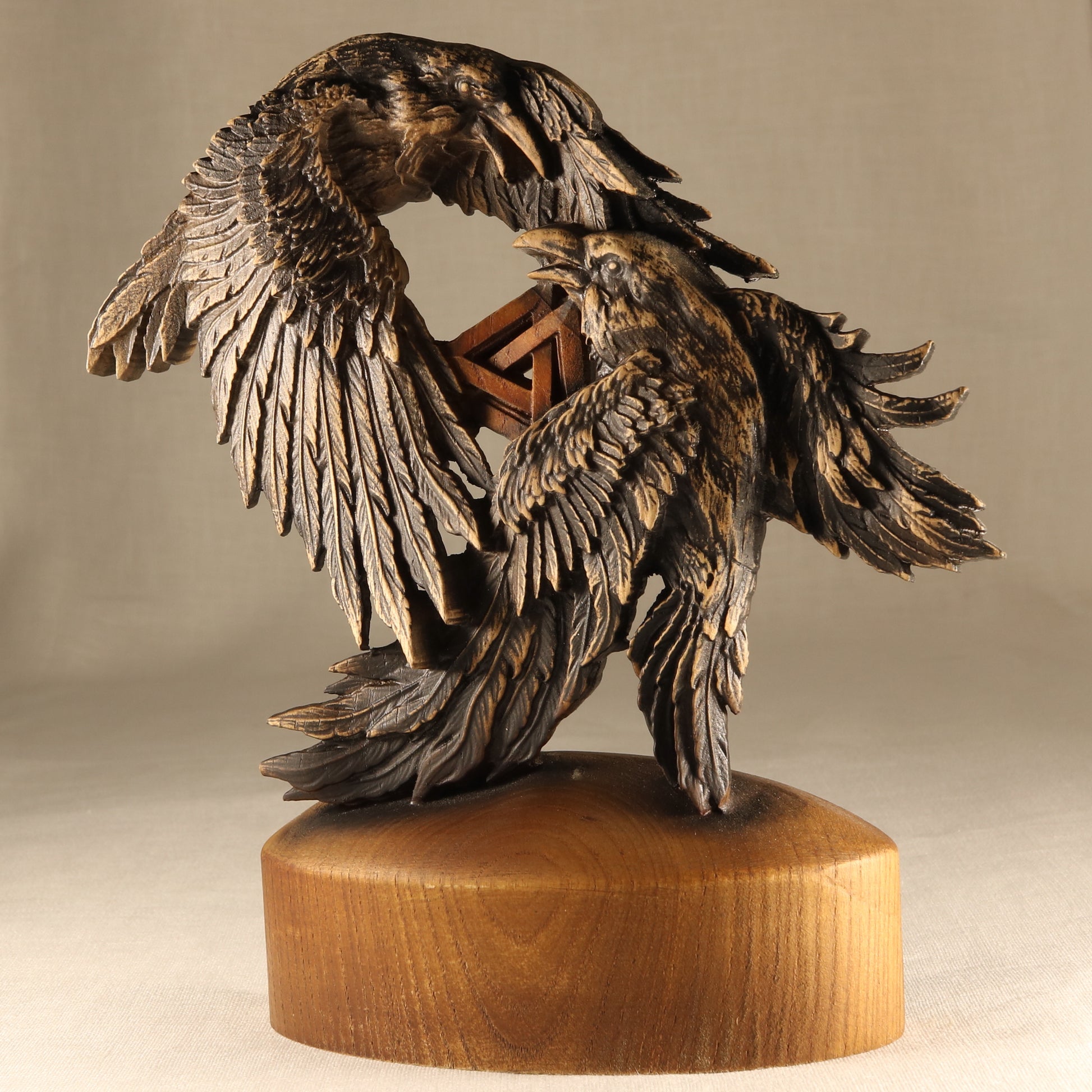 Huginn and Muninn Wooden Statue Raven Art shels wall art