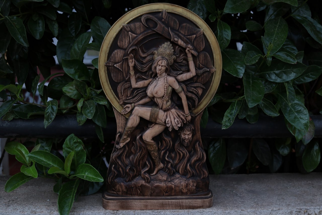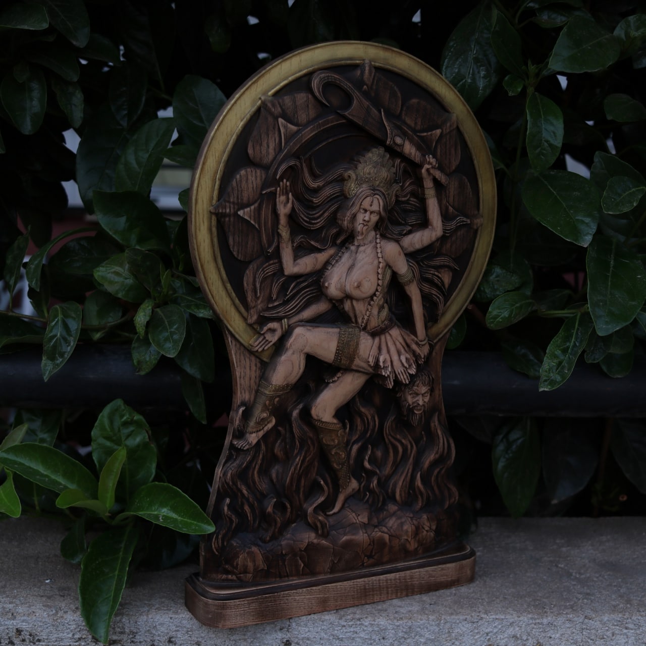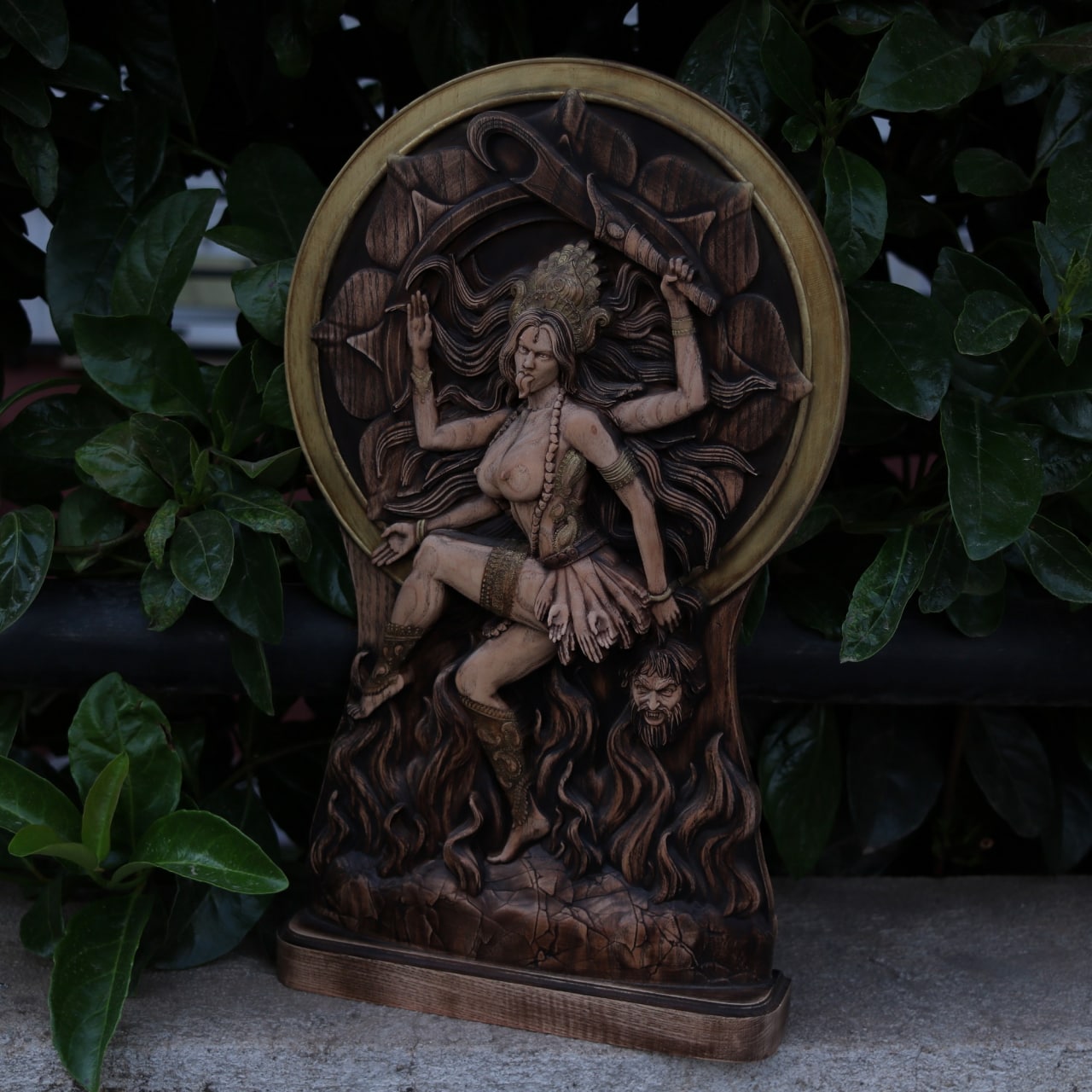 Kali, the Indian goddess of death, destruction, fear, and horror is one of the most powerful and popular deities in Hinduism. She is considered the destroyer of ignorance and the establisher of world order. Kali is also known to bless those who seek to know God. This beautiful wooden statue is a carving of Kali from ecological ash tree material. It has been varnished for protection and to bring out the natural beauty of the wood. This statue makes a perfect addition to any home or office as a reminder of the power of nature and the goddess Kali.