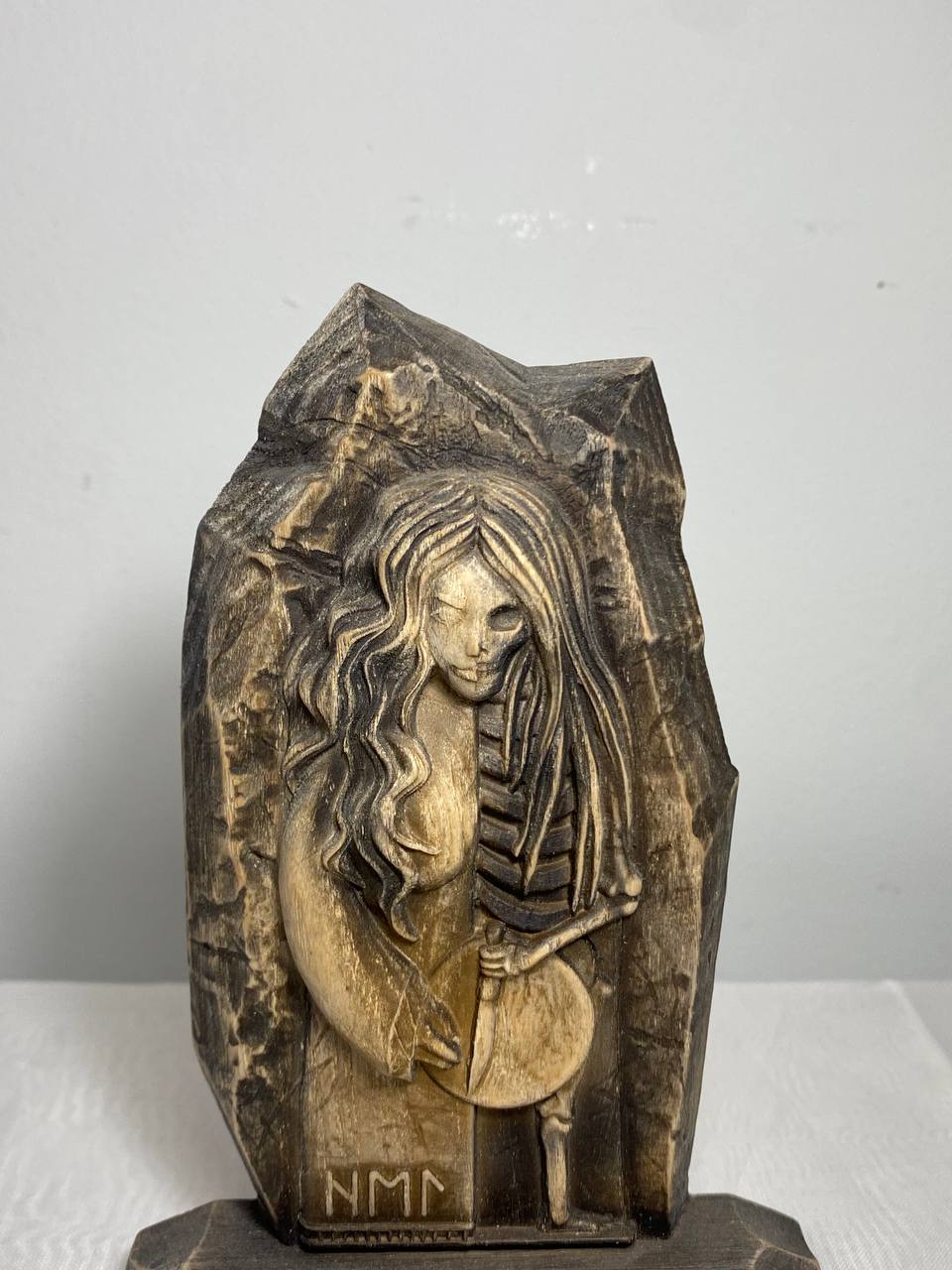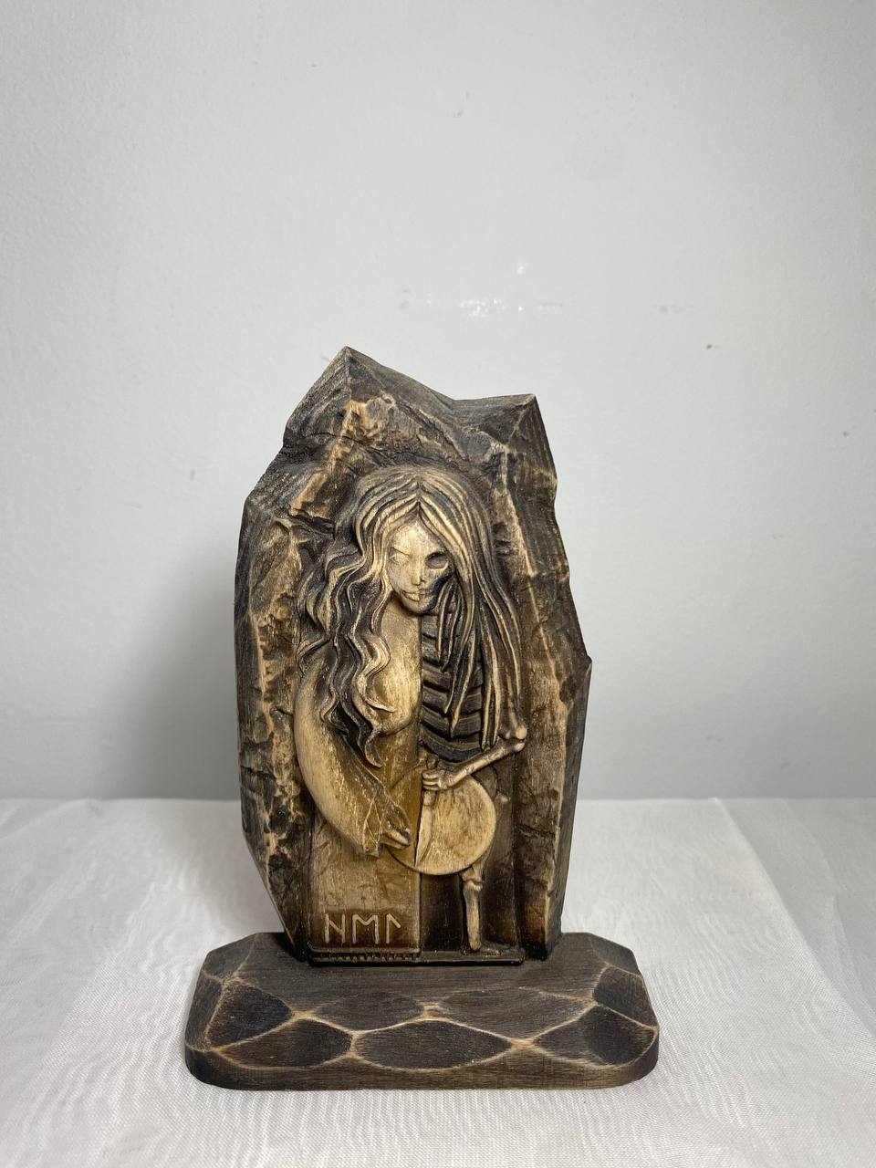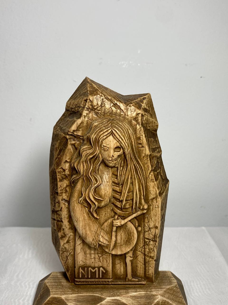 This Goddess Hel statue is a beautiful and unique piece that is perfect for anyone who wants to add a touch of the divine to their home. The statue is handmade from ecological materials and features a stunning carving of the goddess Hel, mistress of the dead. The wood has been given a varnish finish to protect it from the elements and to ensure that it will last for many years to come.