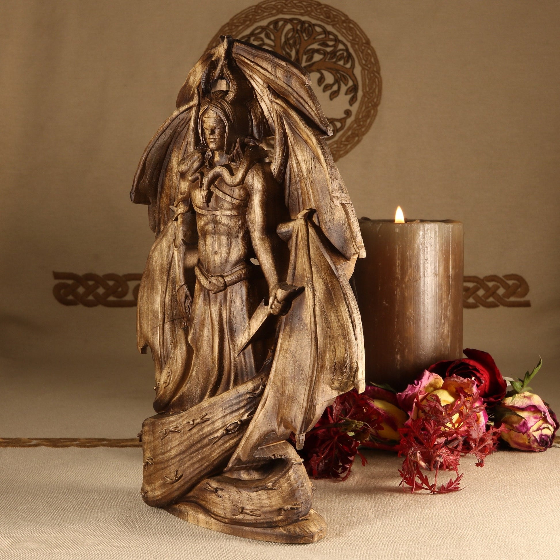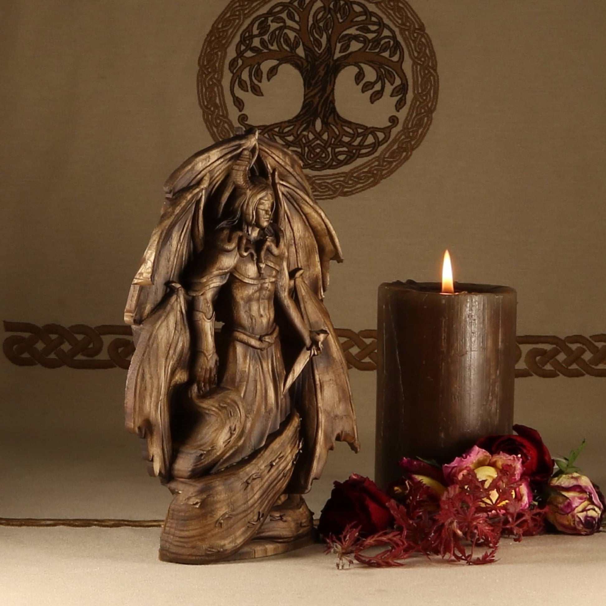 We present to you the handmade Samael statue, the embodiment of destructive power. Samael is the angel of death in Jewish lore and is known as the "left hand of God". He is often depicted as a fallen angel, and this statue perfectly captures his dark energy. The statue is made of an ecological ash tree and has been varnished for extra protection. It makes for a perfect addition to your occult decor.