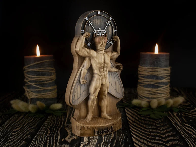 Wooden Beelzebub Statue - an impressive and unique art piece that captivates with its enigma and symbolism. This statue embodies ancient mythological and religious beliefs associated with the image of Beelzebub, which appears in various cultural contexts as a demon or evil spirit.