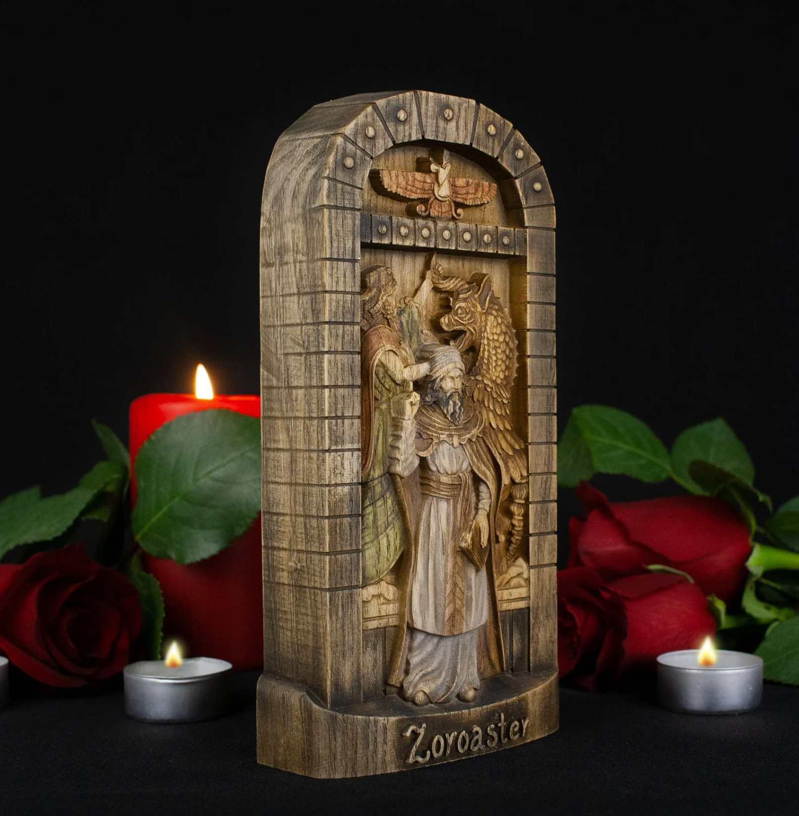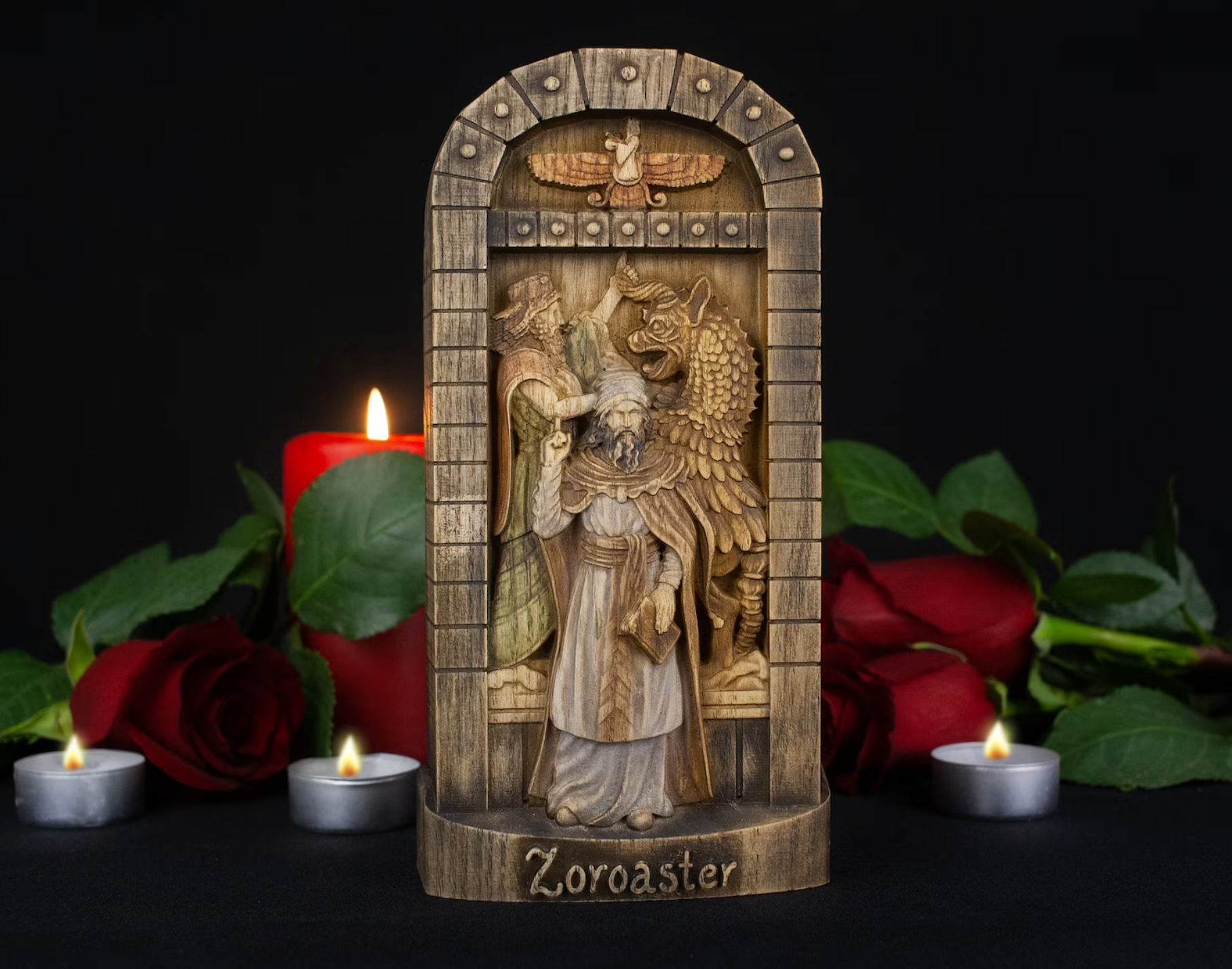 The wooden statue of Zoroaster is an exquisite piece of art that embodies the image of the eminent ancient Persian prophet and founder of Zoroastrianism. It stands out not only for its aesthetic appeal but also for its profound symbolism intricately crafted into its details.